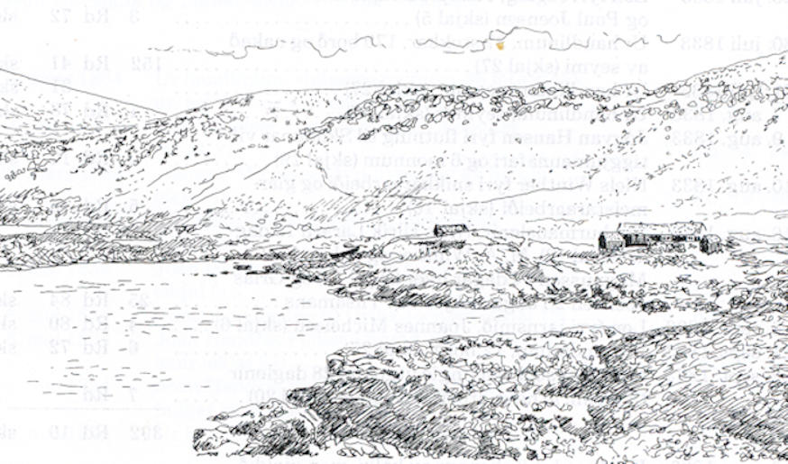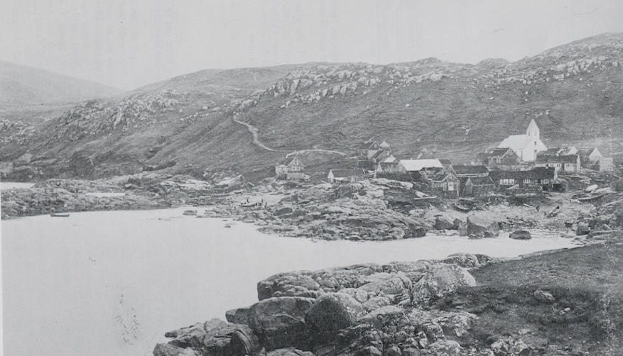 Skopun avmyndað í 1899. Veðurbardur sjóvarmáli, eingin bryggja og bátar drignir niðan í bygdina. (Mynd bókin)