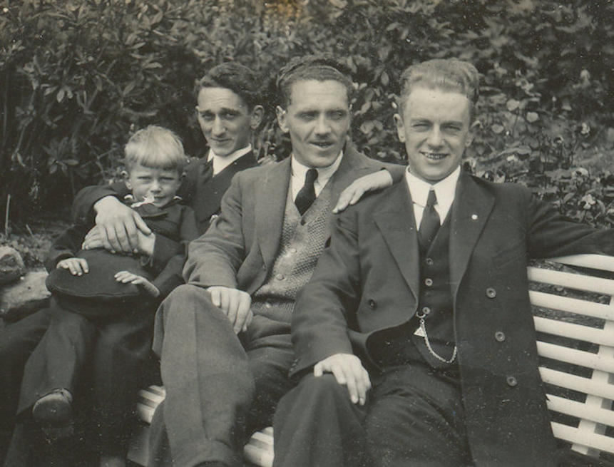 Uttast til vinstru Helge Michelsen við beiggjanum Vagn Erik í fanginum, síðani Moffat Anderson og Aage Michelsen. (Myndin tikin 1933/34)