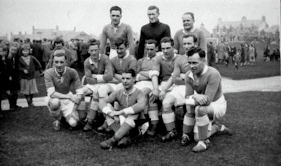 Hetlendska landsliðið avmyndað á Gilbertson park í Lerwich. Moffat Anderson stendur aftast vinstrumegin málverjan. Myndin tikin í 1937.