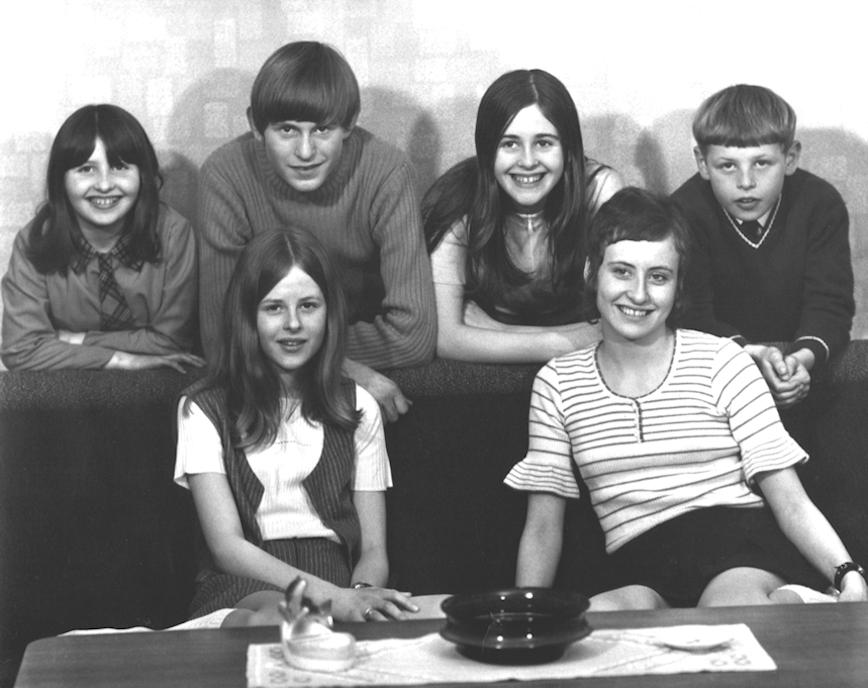 Mynd frá 1967 av børnunum hjá Andreu og Ingvardi Vang. Aftast frá vinstru Hallgerð, Andrew, Kristvør og Herluf. Fremst frá vinstru Annvør og Svanbjørg.