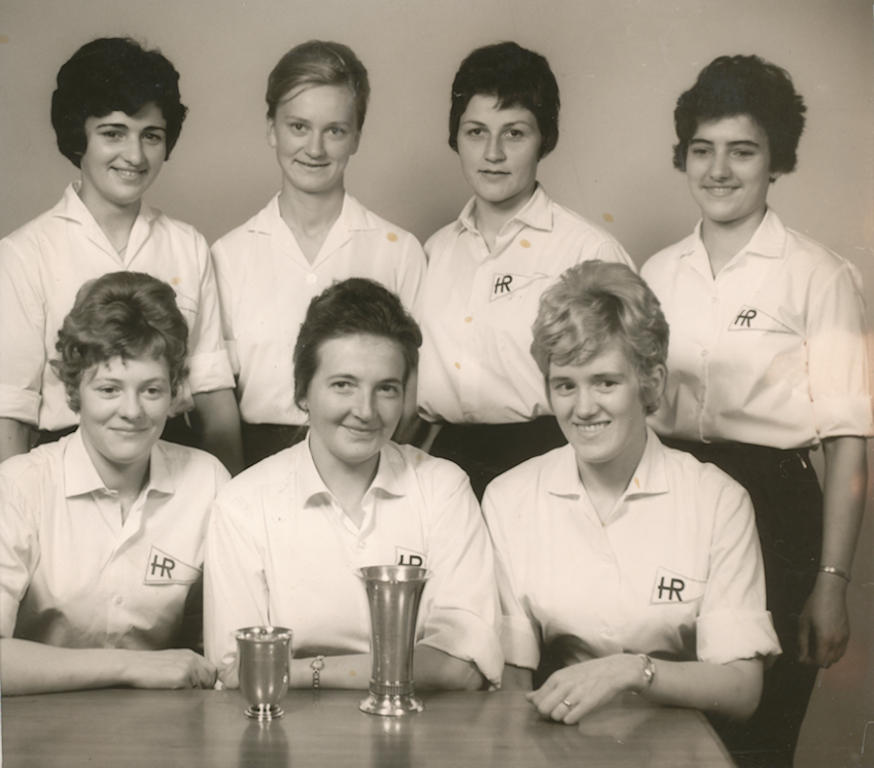 Frálík mynd av sílagentum eftir ólavsøkuróðurin 1963. Aftast frá vinstru: Ruth Poulsen, Maiken Højsted, Margreta Eysturdal og Elsa Poulsen. Fremst frá vinstru: Ellen Lützen, Ingibjørg Samuelsen og Jutta Joensen. (Mynd Bambus)