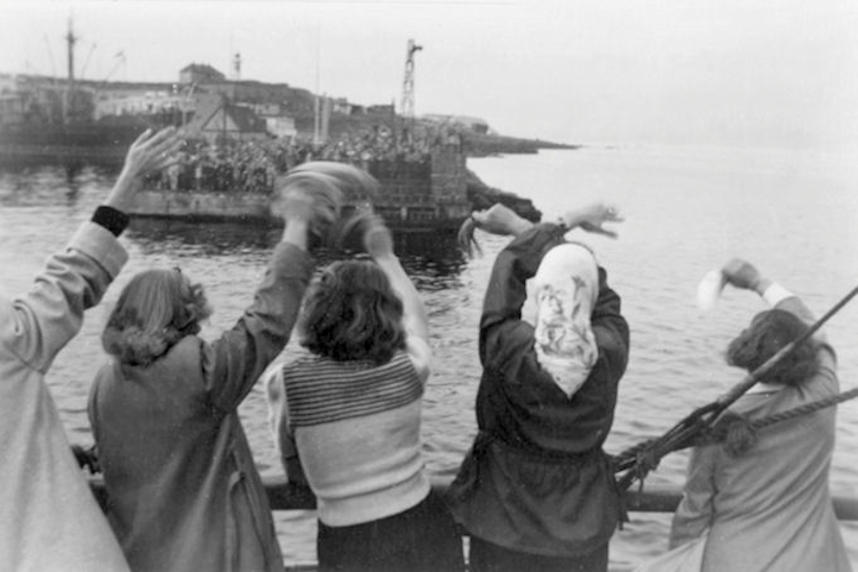 Neistakvinnur fara út um Molan í 1950 á veg til Norra. Nógv fólk veittra teimum farvæl. (Mynd Elsa Horn)