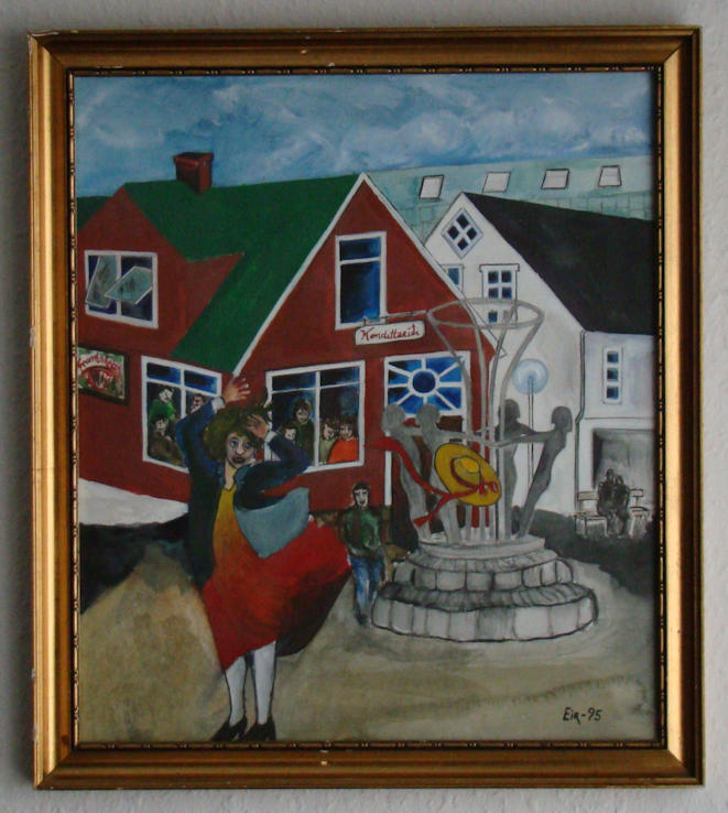 Í 1995 hevði Eir í Ólavsstovu listaframsýning í Smiðjuni í Lítluvík, og ein av myndunum hongur á veggi heima hjá okkum. Forvitnislig góð mynd, sum sigur júst frá, hvønn leiklut Kondittaríið á “Glade hjørn” hevði. Í ungdómsárunum var hetta miðdepulin í Havn, tí mest sum øll ferðsla millum eystur og vestur býin fór báðar vegir gjøgnum hetta knútapunkt.