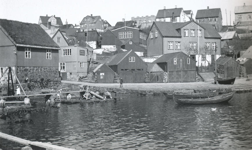 Áhugaverd mynd frá 1927 av vøkrum býlingi niðri á Kongabrúnni. Hetta var fyri tíðina, at stórir betongklossar stungu seg upp her á leiðini. (Mynd: Havnin – fólk og yrki)