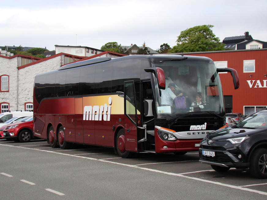 Tey bjóðaðu mær at síggja bussin innann, sum kostar fýra milliónir at keypa í Sveis. 27 ferðafólk eru við á ferðini, og aftast í bussinum var lítil køkur, vs og pláss hjá børnum at fáa sær ein lúr. Ferðafólkini búðu á Sjómansheiminum dagarnar í Føroyum. Báðir ferðaleiðararnir, har annar eisini ansaði køkinum, øtaðust um ferðsluna og parkeringsmøguleikarnar í miðbýnum. – Var hetta í Sveis, so var gjørdur parkeringskjallari undir Skálatrøð, og Skálatrøð gjørd til vakra park. Men økið liggur so nær sjónum, so hetta er lættari sagt er gjørt, helt annar ferðaleiðarin, sum ivaðist um undirlendið. Blíð fólk má sigast og áhugaverd parkeringsmynd. (Vagnur)