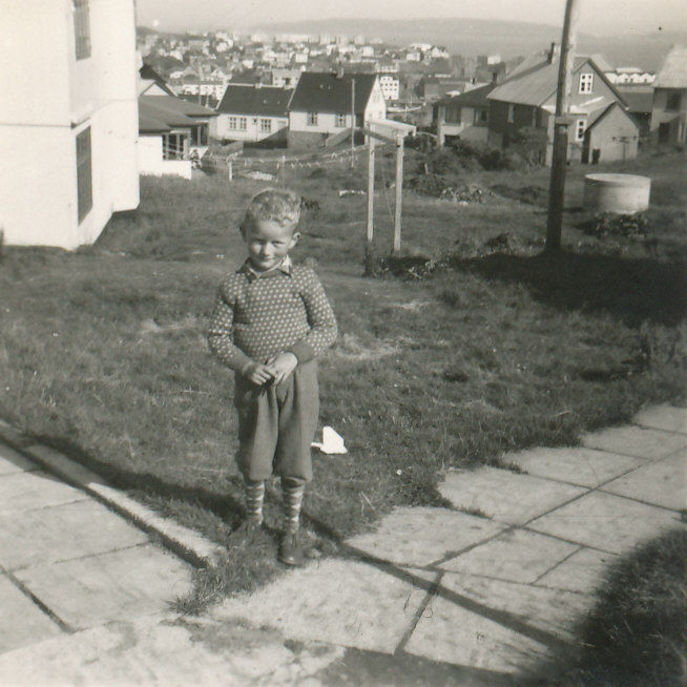 Betongrottangi sæst til høgru, og húsini hjá okkum koma undan vinstrumegin. Smádrongurin er Torbjørn beiggi mín.