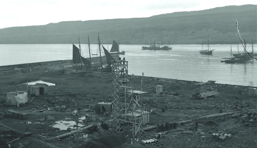 Síggi, at teir stoypa kloakkrørini á staðnum, men ongar maskinur eru at síggja. Eisini áhugavert at síggja út á Argir, hvussu húsini standa spreidd, og teir hava velt niðan undir hamaran. Á myndini síggja vit eisini smáar smáttur, og so er spurningurin, um børnini hava bygt smátturnar, ella hetta eru arbeiðssmáttur. Danir stóðu fyri øllum byggistigunum av Molanum. Fibiger & Villefrance stóð fyri fyrsta 1. byggistigi, Kampsax fyri 2. byggistigi og Phil & Søn longdi Molan út í fulla longd. (Vagnur)