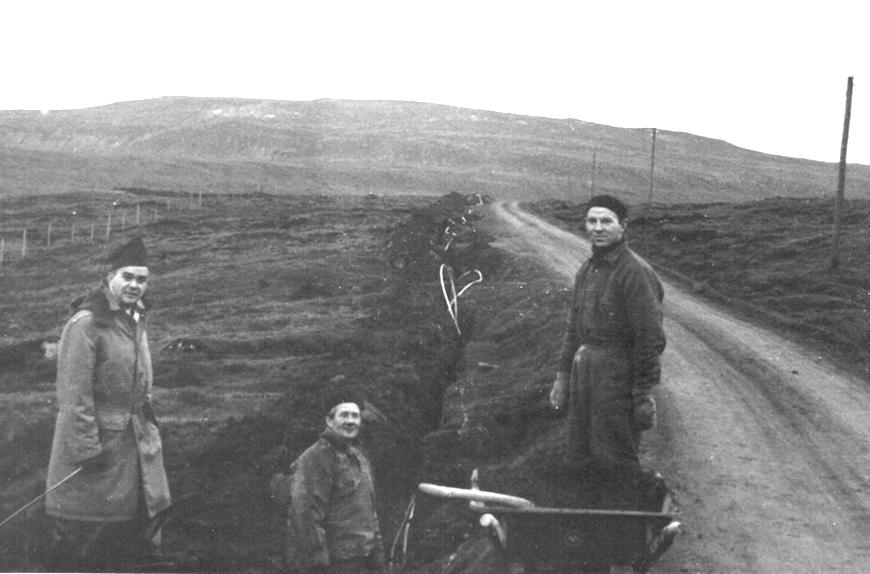 Tá í útvarpinum hósdagin hoyrdist, at Jóhan Norðfoss var farin 97 ára gamal, kom eg at hugsa um áhugaverda mynd, sum er at síggja í Christian Holm Jacobsens myndasavni. Tríggir kendir menn við Velbastaðvegin, sum práta um arbeiði. Jóhan kendu vit væl frá svimjihylinum. Frá vinstru Vagn Erik Michelsen, Jóhan Norðfoss og Herluf Jacobsen. Hví er so Vagn Erik á myndini, jú, hann arbeiddi á Telegrafstøðini, og her skal telefon – og telegrafkaðal leggjast úr Havn til Velbastaðar og Kirkjubøar. Alt arbeiðið gjørt við spaka, eyrhakkara og trillibør, og vit síggja tveir kaðalar. Nú fór Jóhan, Herluf er eisini farin, og Vagn Erik, sum er 90 ára gamla, er dementur og býr á Tjarnargarði. Vegurin er einsporaður eyrvegur. Men nær komu so fyrstu vegirnir í Føroyum. Fann niðanfyri brot.