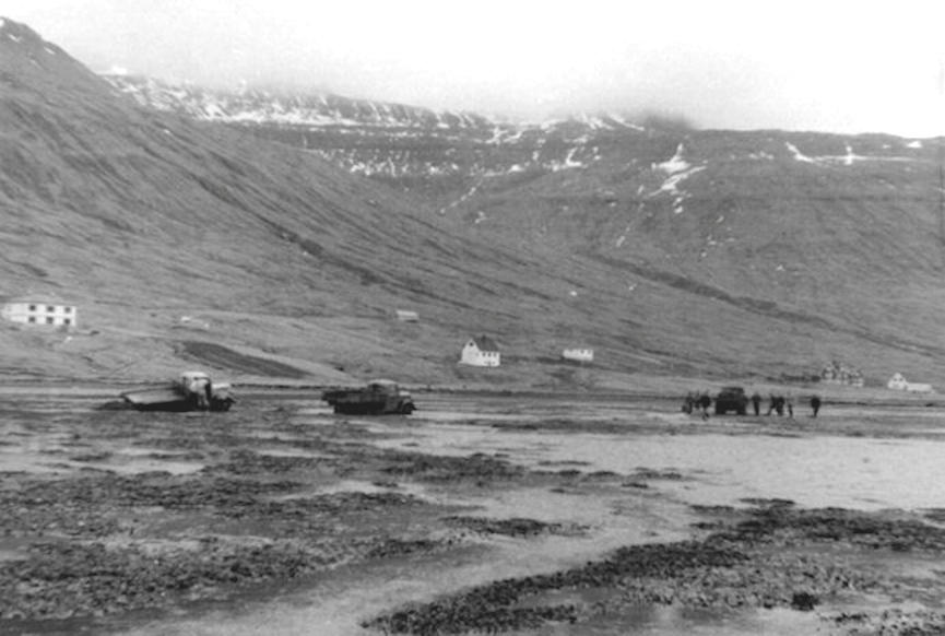 Myndina omanfyri tók Christian Holm Jacobsen, sáli. Vit síggja tríggjar Bedford lastbilar koyra sand av Hólmanum í Kollafirði, men ein av bilunum er smokkaður í bleyta sandinum. Eg havi prátað við eldri kollfirðing um myndina, og hann sigur mær, at teir tríggjar Bedford lastbilarnar áttu Karl Jensen, Menning Geyti og Hallgrímur Hansen. Myndin er tikin fyrst í 1950-árunum. Áhugavert, tí Oyggjarvegurin var ikki bundin saman fyrr enn 6. juli í 1966, tá koyrandi var millum Havnina og Kollafjørð. Nógv annað áhugavert er at síggja á myndini. Læs resten