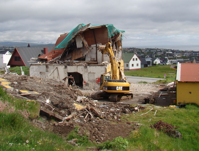 Tað gekk skjótt hjá gravimaskinuni at bróta niður betongveggirnar. Í gula húsinum til høgru goymdu teir eisini saltfisk. Seinni hevði Johannes Berg bilverkstað har. (Mynd Vagnur)