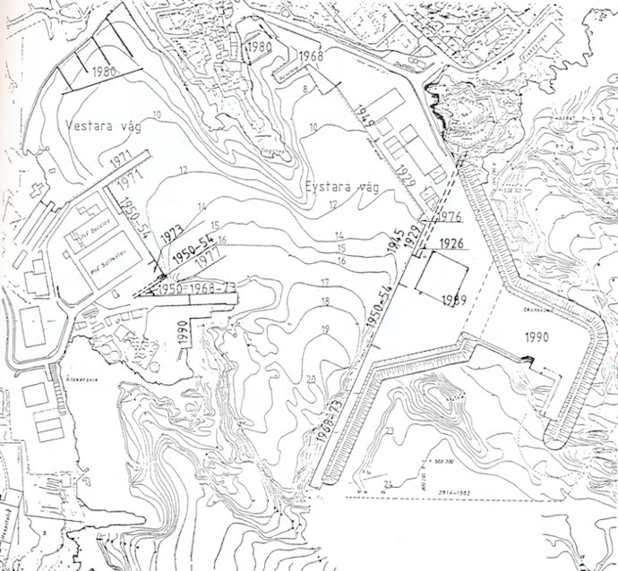 Kom í bókini Lossingarmenn í Havn fram á omanfyri tekning av Tórshavnar Havn. Tekningin er frá 1990, men so skal sigast, at frá 1990 og til nú 2017 er eingin havnarbygging farin fram í Havn. Á tekningini kanst tú síggja, nær ymsu bryggjurnar er gjørdar. Havnin var brimpláss, men í 1926 var byrjað at gera Molan, og so kunnu vit síggja í hvørjum tíðarskeiði Molin var longdur í fleiri umførum. Sjálvur minnist eg bara seinasta streggið, sum var gjørt árini 1968-1973. Eisini áhugavert at síggja nær “Ískaiin” var gjørd, og ikki at gloyma bryggjurnar fram við Bacalao. Nú eru meira enn 25 ár liðin, síðan “Nyhavnin” var gjørd, og so síggja vit eisini, at í 1929 var bryggja gjørd, har Tjaldrið plagdi at leggja at, og at vit skulu aftur til 1968, tá bryggjan var á Bursatanga gjørd. Tekningin er serliga áhugaverd, tí árstølini eru við. (Vagnur)