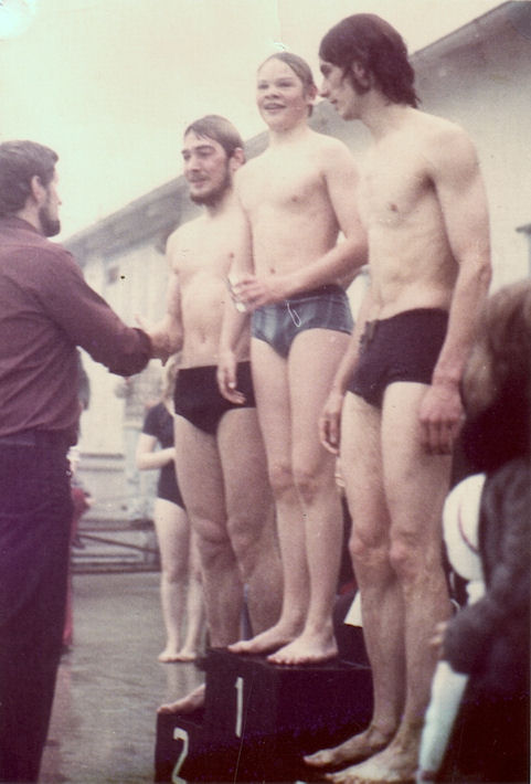 Sjálvandi sveimaðu tankarnir beinanvegin, og eg minnist væl 35 ára jubileums- kappingina hjá Havnar Svimjifelag. Tað serliga við myndini er, at eg um tað mundið var 23 ára gamal, Carl 21 ára gamal og Áki 15 ára gamal.