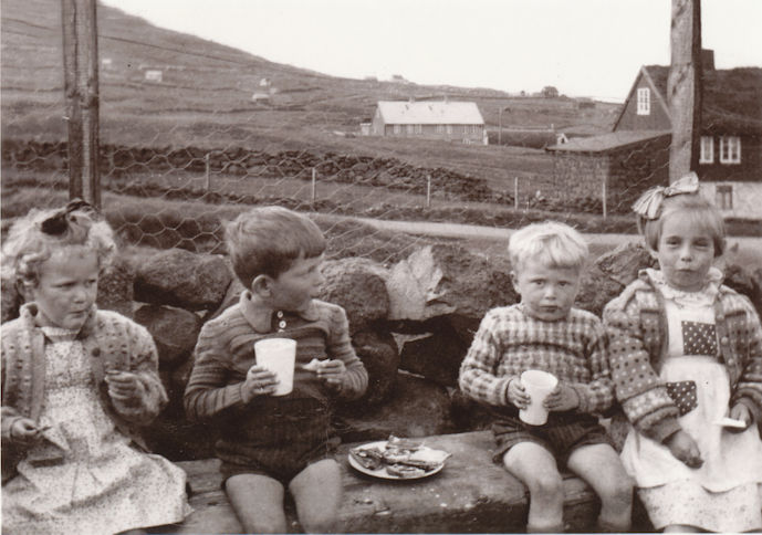 Myndin omanfyri er tikin í grannalagnum hjá okkum beint eftir kríggi. Vit síggja niðan í Grønland, har lítið og einki er bygt. Nógvu húsini í Grønlandi vóru bygd seinast í 1940-árunum og fyrst í 1950-árunum, og seinni í mínari tíð kom býlingurin upp í Líðunum. Børnini á myndini eru frá vinstru systir mín Chirstin Dahl Plate, síðani systkinabørnini Christian, Vilhjálmur (Lill) og Gunnvør Cristiansen. Debes Chistiansen pápi tey trý systkini og mamma eru systkin. Børnini sita í garðinum hjá Torgerd og Dagny Mohr, sum vóru ógvuliga barnavinaligar. Tær vóru ógiftar og arbeiddu báðar í Føroya Banka. Bæði nærmastu húsini á myndini eru áhugaverd og søgulig í okkara hugaheimi. Læs resten