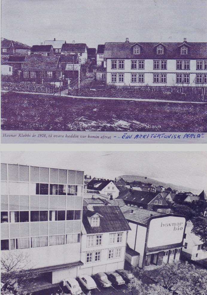 Í 2011 kom út forvitnislig bók “Endurminningar – Heri Mohr”. Heri var stjóri á Gjaldstovuni í nógv ár, og umframt at bókin snýr seg um lívið hjá Hera, so skrivar hann nógv um tíðina á Gjaldstovuni. Í bókini eru nógvar familiumyndir, men eisini aðrar myndir. Heri Mohr, sum eg kenni væl, er bersøgin maður. Hann hevur skrivað nógvar greinar í bløðini, og er ikki bangin at siga sína hjartans meining um ymist í samfelagnum. Frálíkt, at vit hava slík fólk. Á síðu 179 í bókini er áhugaverd mynd, og Heri sigur eisini sína meining um myndina. Ovara myndin av Klubbanum frá 1908 far gott skoðsmál frá Hera, har hann skrivar: Ein arkitektonisk perla. Niðara myndin fær annað skoðsmál frá Hera: Arkitektonisk afturstig. Og rætt hevur Heri. Guð viti, hvat arkitektarnir og býráðið hava hugsað, tá tey á sinni góvu byggjuloyvi til hesar kassar í miðbýnum. Einki hugflog og nógv akritektonisk afturstig í okkara tá vakra miðbýi. Sum ovara myndin er góð við vøkrum skipaðu húsum við nógvum laðaðu garðum í góðum føroyskum stíli. Niðara myndin er beinleiðis syrgilig. (Vagnur)
