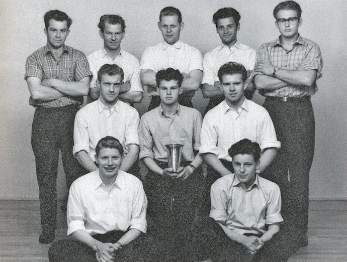 10-mannafarið Studenturin frá 1959. Standandi f.v: Arni Clementsen, Poul Stein Poulsen, Martin Rørsvig, Sørin Pram Sørensen og Gorm Justinussen. Miðjan f.v: Sigmund Arge Gregoriussen, Høgni Danielsen og Jógvan Højsted. Fremst f.v: Groth Nolsøe og Hans Ludvig. Har vantar ein maður, hvør er so tað? (Mynd: Lützens foto)